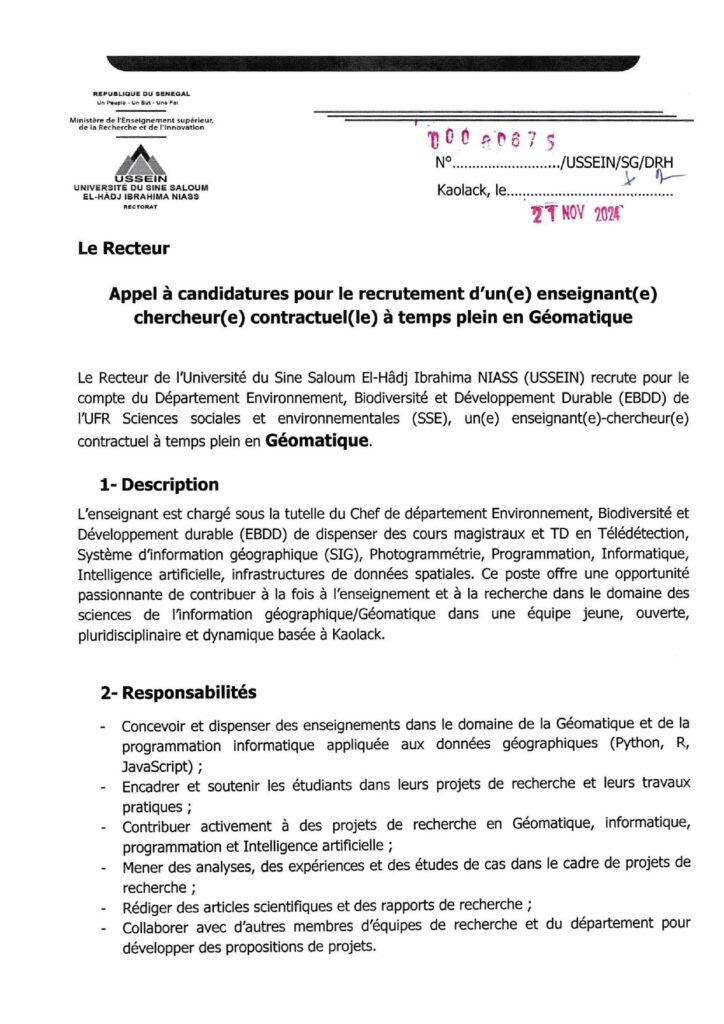Recrutement d’un(e) Enseignant(e) chercheur(e) contractuel (le) à temps plein en Géomatique