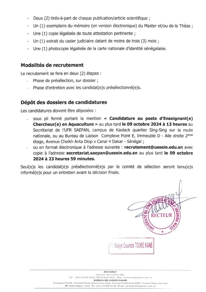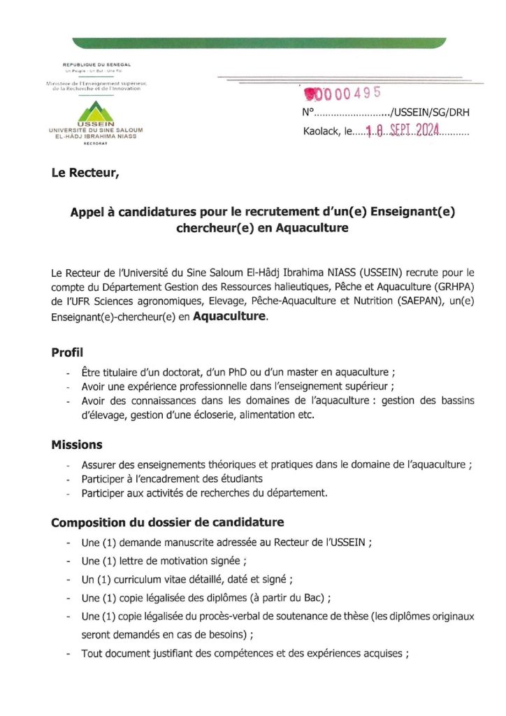 Appel à candidatures pour le recrutement d'un(e) Enseignant(e) chercheur(e) en Aquaculture ussein 1222