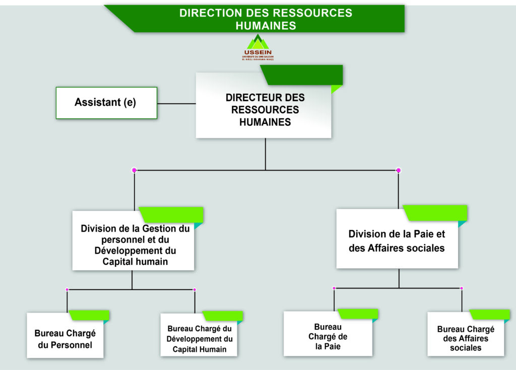 La Direction des ressources Humaines placée sous la responsabilité du Directeur des ressources Humaines est ainsi organisée :