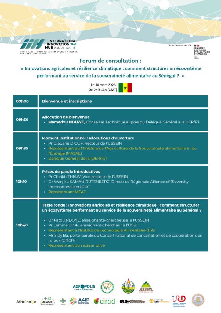 Ce forum est organisé par l’Universite du Sine Saloum El Hadj Ibrahima NIASS (USSEIN) dans le cadre du projet Fonds Equipe France « International Innovation Hub-West Africa », une initiative qui vise à construire un écosystème de Structures d’Accompagnement à l’Entrepreneuriat et à l’Innovation (SAEI) pour relever les défis de la transformation et du développement des systèmes alimentaires. Ce projet de deux ans rassemble un consortium de douze organisations de recherche et d’innovation, porté par des universités de pointe au Sénégal, au Bénin et en Côte d’Ivoire (l’Université Ussein, l’Université Abomey Calavi, l’INP-HB/ESA) ainsi qu’Agropolis International, l’Institut Agro Montpellier, CGIAR, l’Alliance of Bioversity International and CIAT via la plateforme CGIAR Accelerate for Impact, le CIRAD, l’IRD, l’Université Gaston Berger, la DER/FJ et Afric’Innov.