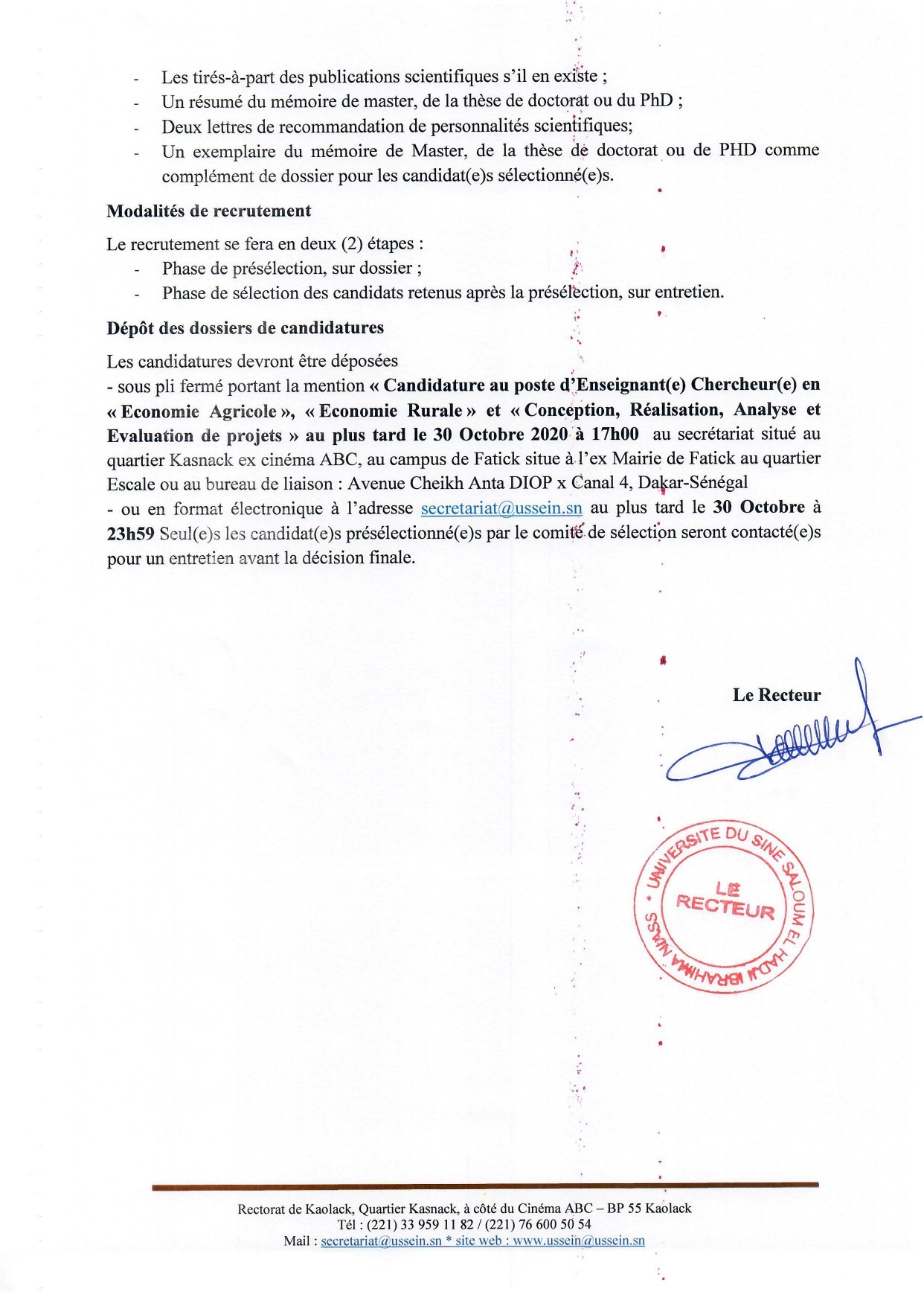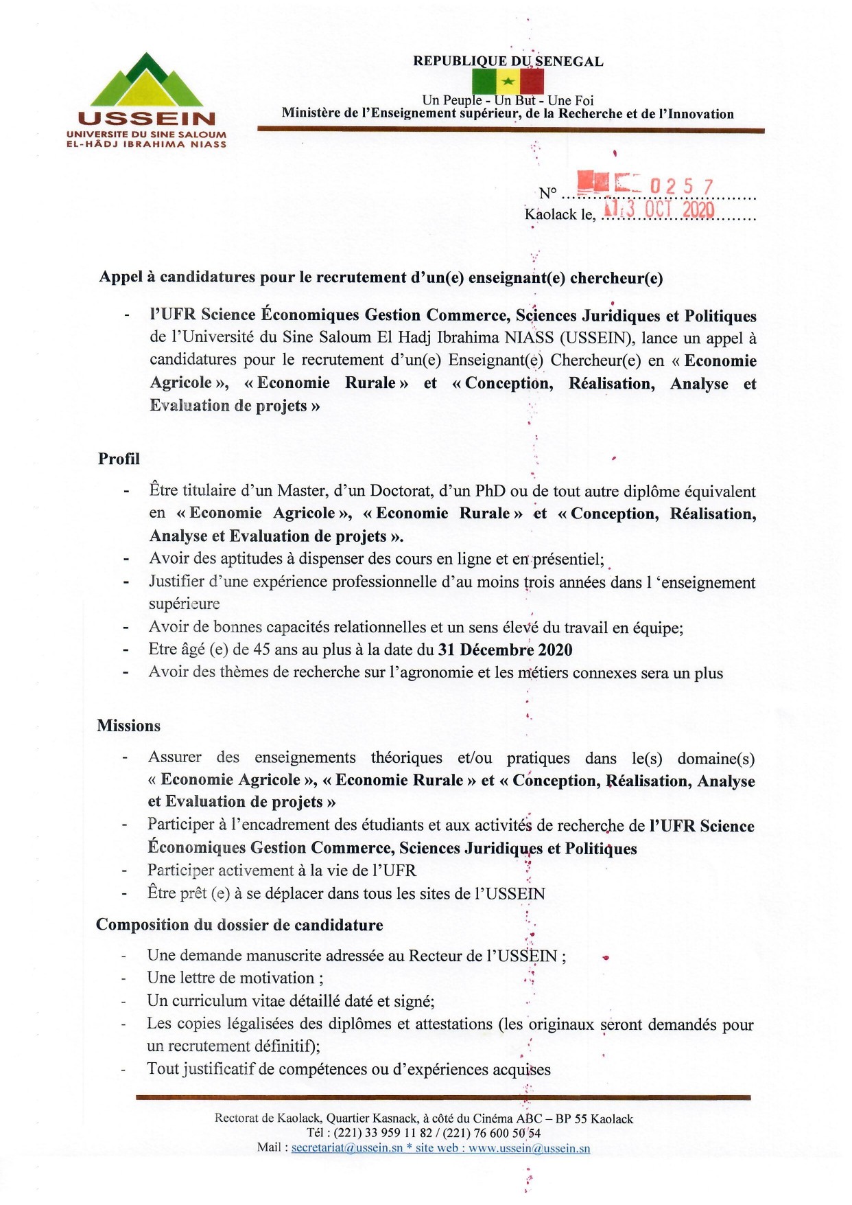 Recrutement d'un (e) enseignant (e) chercheur (e) en Economie Agricole, Economie Rurale et Conception, Réalisation, Analyse et Evaluation de Projets