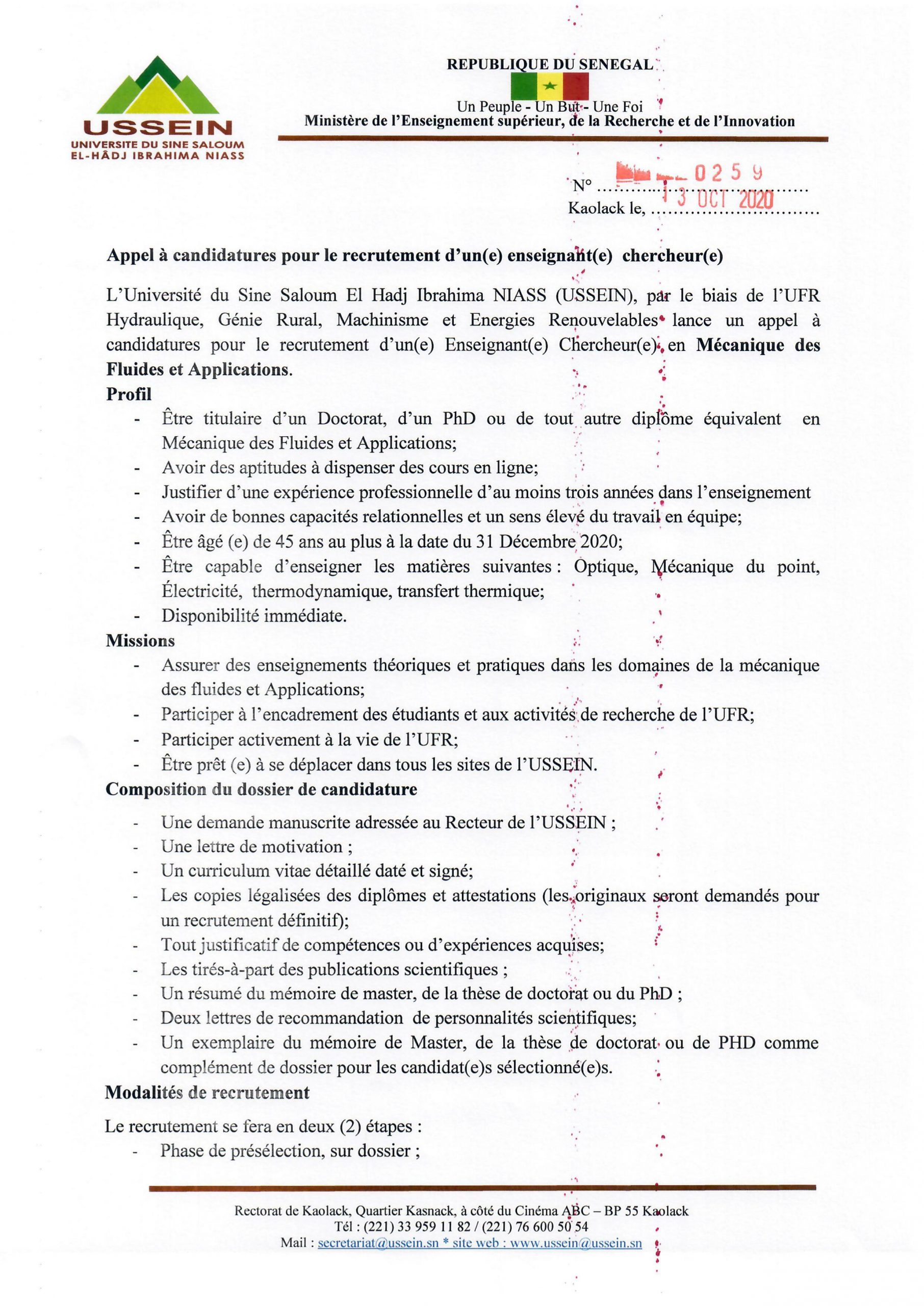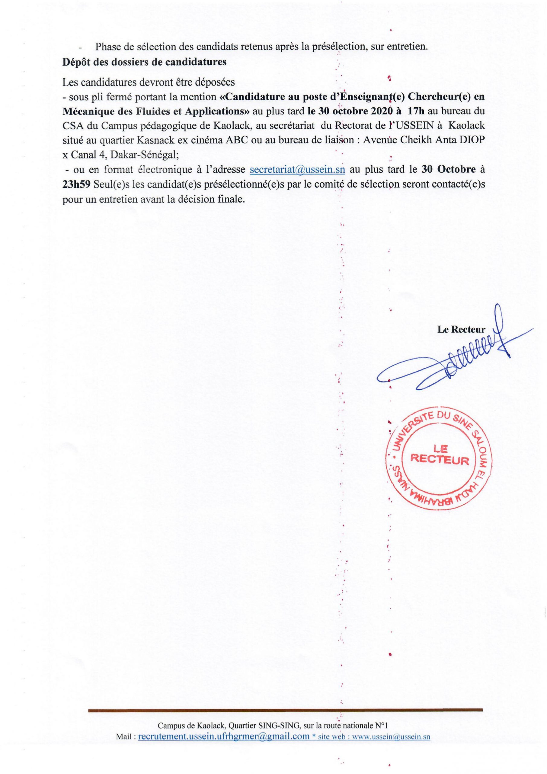 Recrutement d'un enseignant (e) chercheur (e) en Mécanique des Fluides et Applications ussein 742 14 octobre 2020