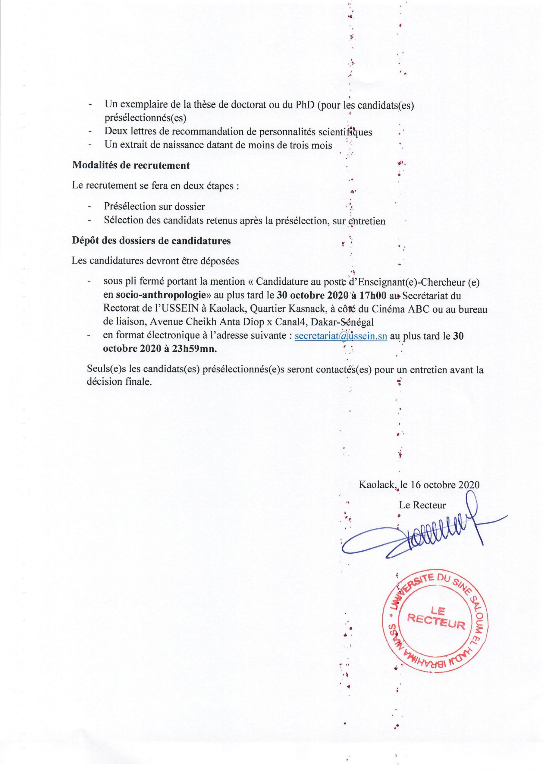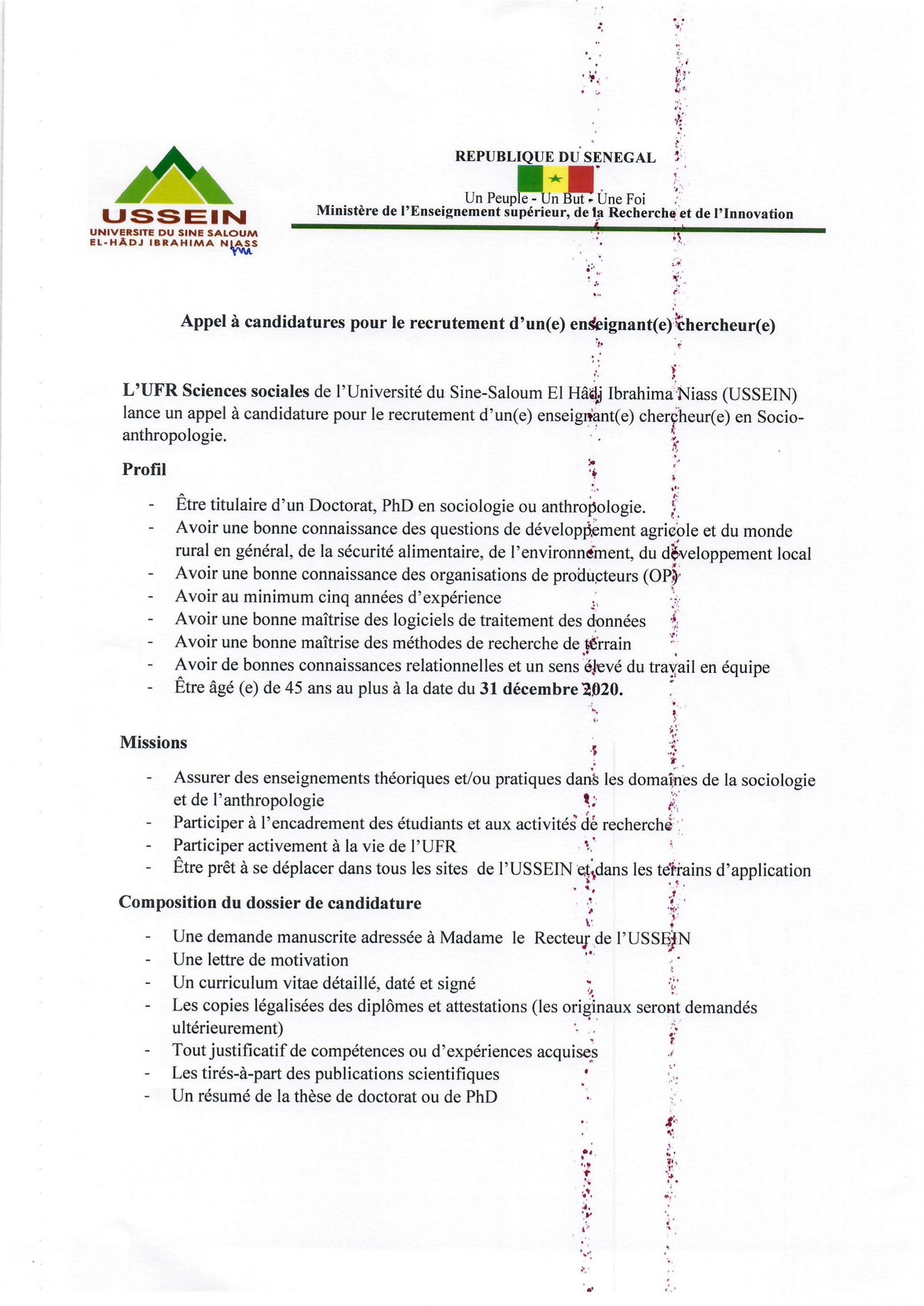 Recrutement d’un(e) enseignant(e) chercheur(e) en Socio-Anthropologie