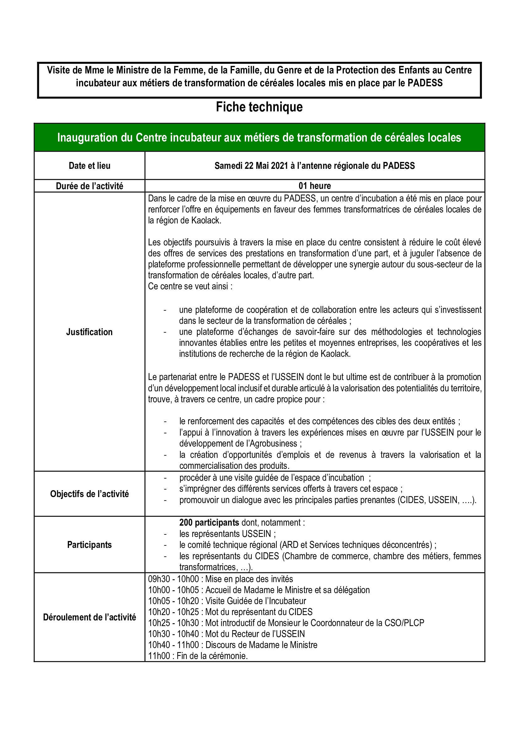 Visite de Mme le Ministre de la Femme, de la Famille, du Genre et de la Protection des Enfants au Centre incubateur aux métiers de transformation de céréales locales mis en place par le PADESS